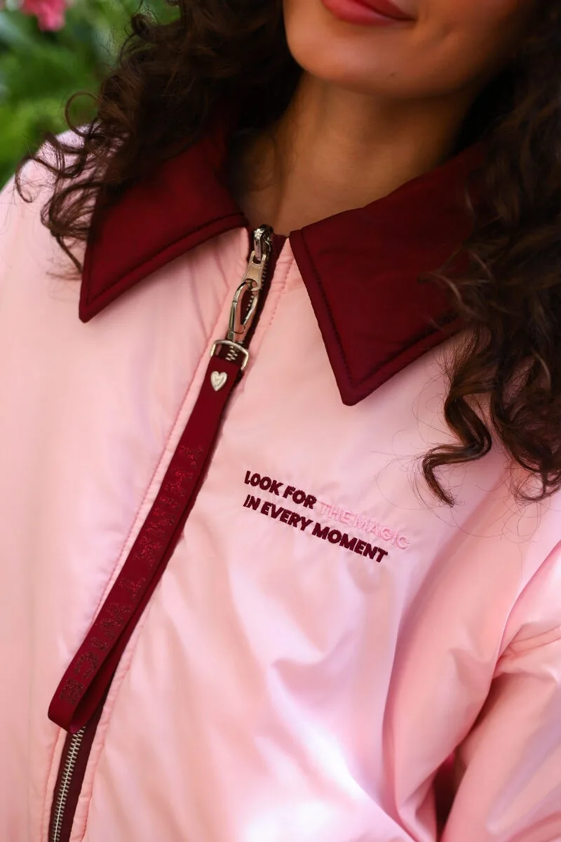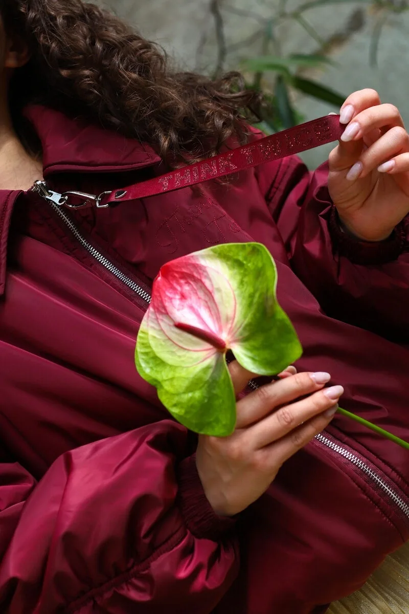 Марсалова, однотонна сторона — для поціновувачів стриманого стилю та мінімалізму. Глибокий, насичений відтінок дарує образу елегантність, а продуманий крій і зручні кишені з кнопками додають функціональності. Цукерково-рожева сторона — для тих, хто не боїться мріяти та привертати увагу. Вишивка спереду “Look for the magic in every moment” задає настрій, а напис ззаду “Think Twice” — залишає після себе загадкове враження. Застібка оздоблена фірмовою стрічкою з блискучим акцентом.