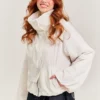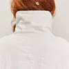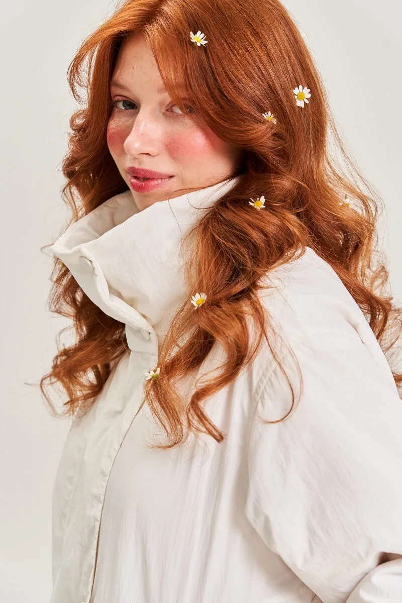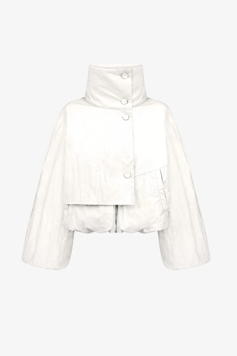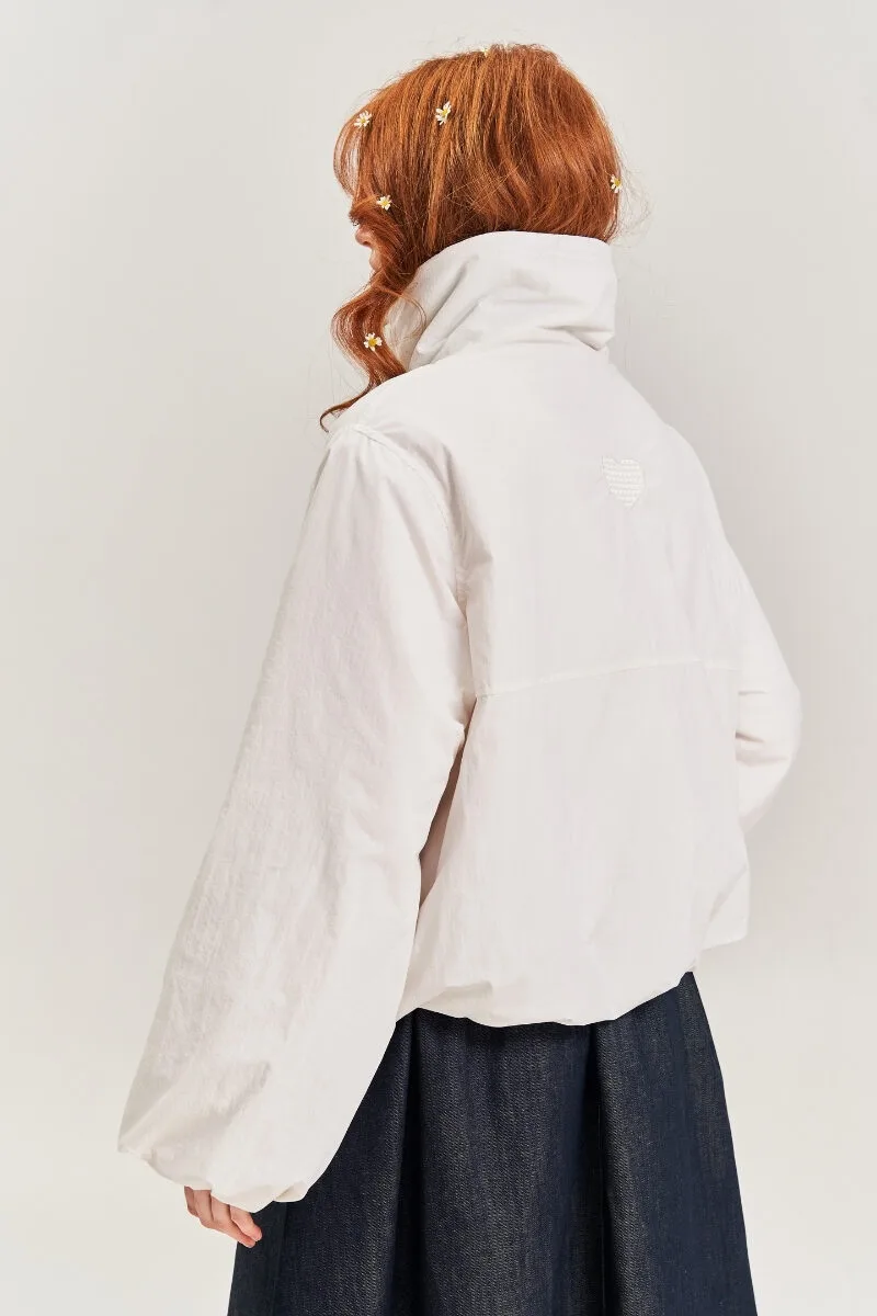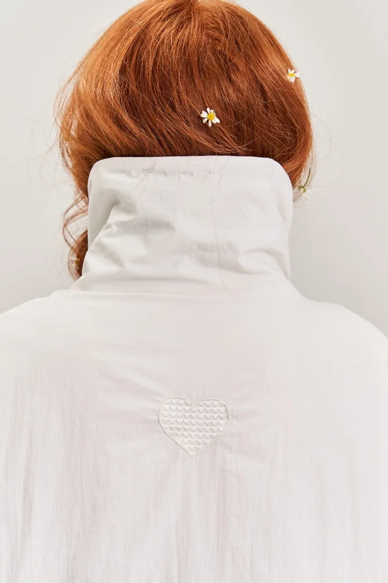 Легка куртка-балон із об’ємним силуетом, що формує сучасний, невимушений образ. Модель із високим коміром-стійкою та застібкою на блискавку. Декоративна деталь на ґудзиках проходить від коміра до середини виробу. Бічні кишені інтегровані в конструкцію. Низ на резинці з фіксаторами дозволяє змінювати силует. Об’ємні рукави підкреслюють характер даної моделі куртки. Всередині віскозний підклад у смужку. На спині – вишивка у вигляді серця. Про любов до деталей, вкладену в кожен елемент. Маленькі серця всередині – це люди, команда і внесок кожного, хто створює бренд. Для теплої пори року.