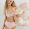 Виготовлені з 100% бавовни труси мають текстуру, подібну до рушника, що забезпечує відмінну м’якість і високу вбираючість. Вони створені в комплекті з Махровий топ для того, щоб забезпечувати максимальний комфорт вдома, але їх функціональність виходить далеко за межі домашнього використання. Можуть доповнювати посвякденні образи, а також слугувати як купальник, що робить їх ідеальним варіантом для пляжних поїздок. Виріб прикрашає контрастна вишивка у вигляді мушлі.